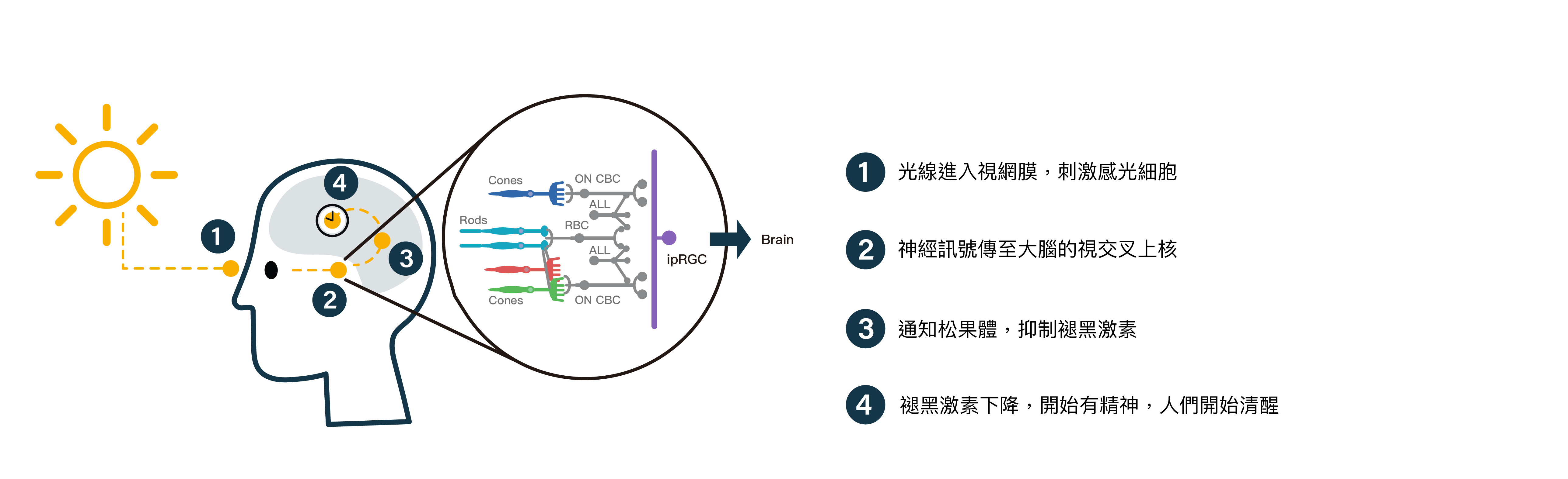 人體有五種感光細胞,其中,只有 ipRGC 會把光訊號傳到大腦SCN (生理時鐘中樞) ,進而改變晝夜節律。